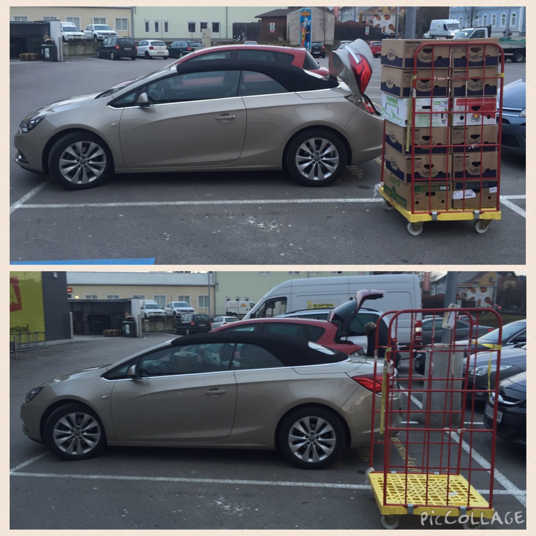Man sieht dass ein Cascada einen Kombi ersetzen kann. 12 Schachteln haben Platz gefunden.